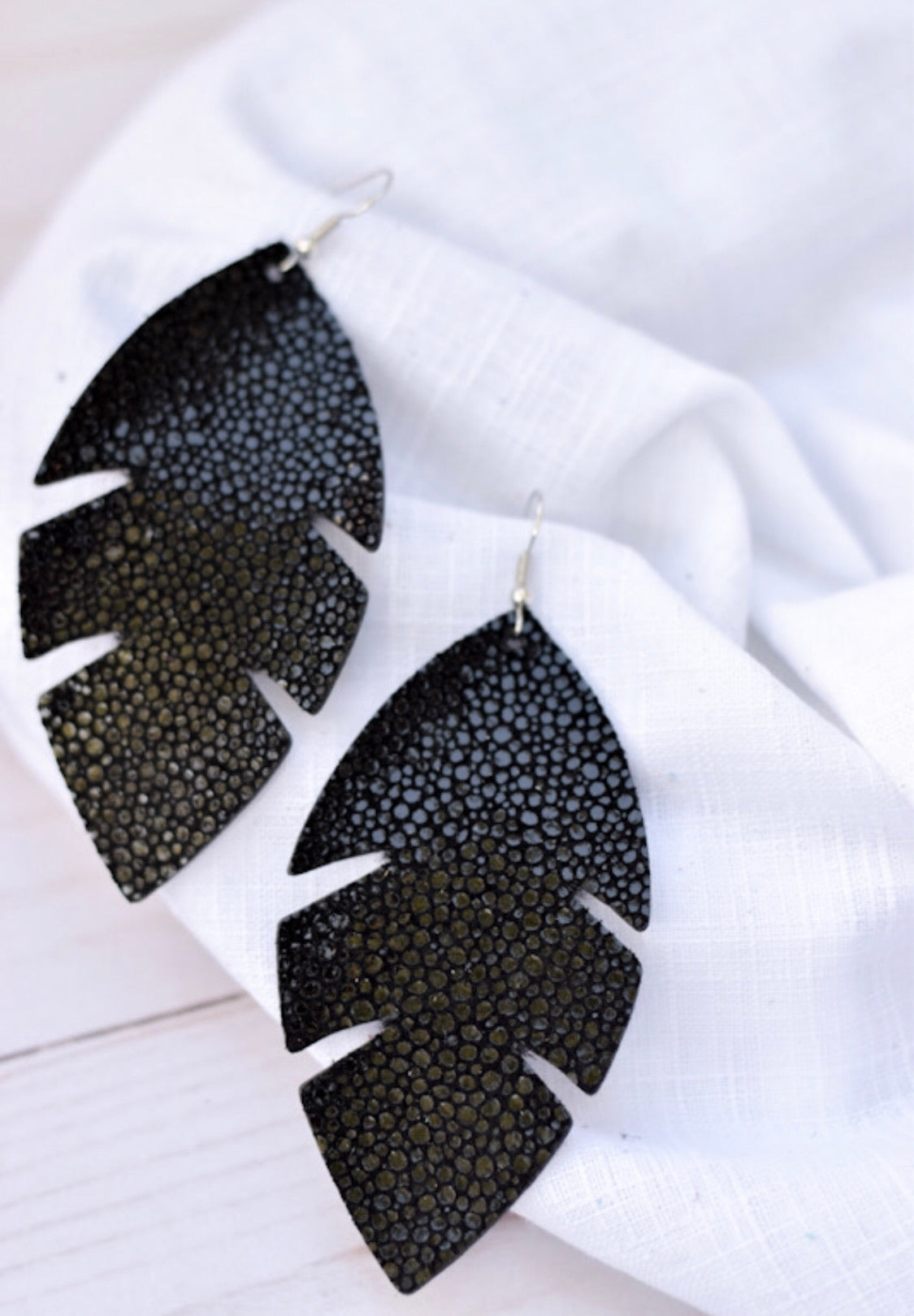 Black pebbled leather with a finish that catches the light! Very fun and festive.